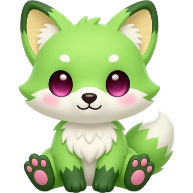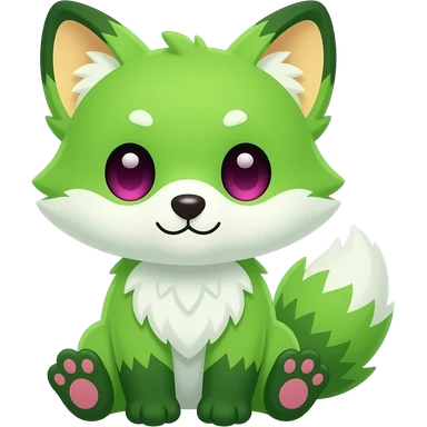 Cute chibi kawaii mossy forest Neon-light-lime-green furry fox with white belly and white muzzle, dark-green paws, dark green ears, and magenta eyes, pastel-yellow-beige inside ears-pinna/ear flap, pink paw pads emoji
