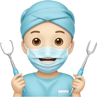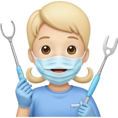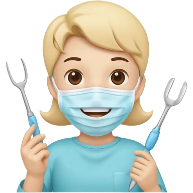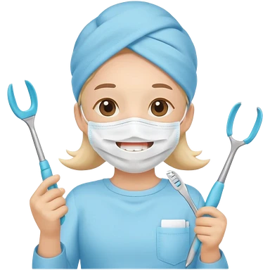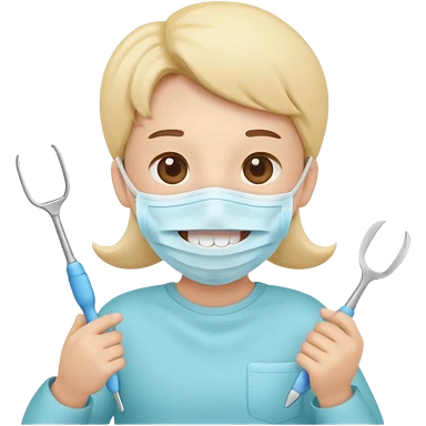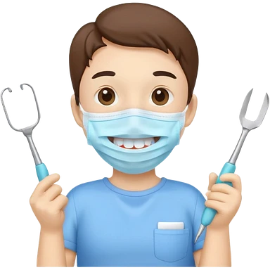 Cute tooth character wearing a face mask, holding dental tools, friendly and clean emoji style, flat illustration, simple design, white background. emoji