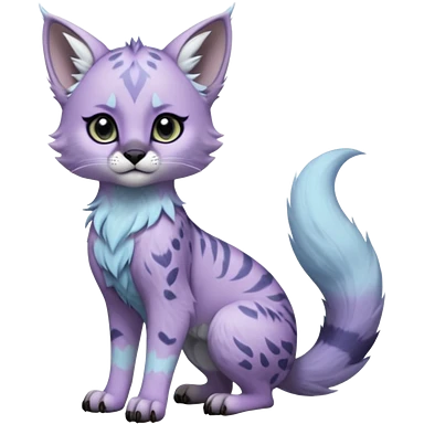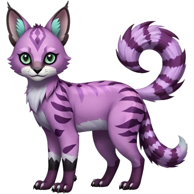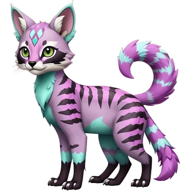 Cute kawaii cool edgy badass Colorful pale minty lilac onyx fruity glorious exotic neon vibrant zigzagged fantasy-caracal-civet-genet-sergal-vernid-Gryphon-Cacomistle-Trico-oncilla-animal-Fakémon-hybrid-fursona (full body), facial markings, (realism style) emoji