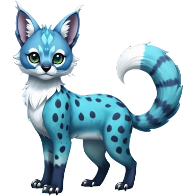 Cute kawaii cool edgy badass deep ocean-indigo fur with bioluminescent aqua speckles fantasy-caracal-civet-genet-sergal-vernid-Gryphon-Cacomistle-Trico-oncilla-animal-Fakémon-hybrid-fursona (full body), facial markings, (realism style) emoji
