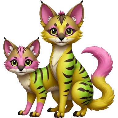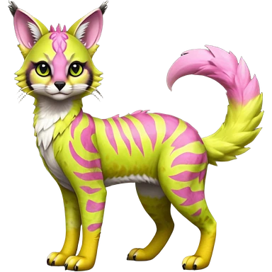 Cute kawaii cool edgy badass vivid tropical mango-lime-pink splash-patterned silky fur fantasy-caracal-civet-genet-sergal-vernid-Gryphon-Cacomistle-Trico-oncilla-animal-Fakémon-hybrid-fursona (full body), facial markings, (realism style) emoji
