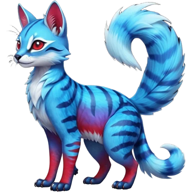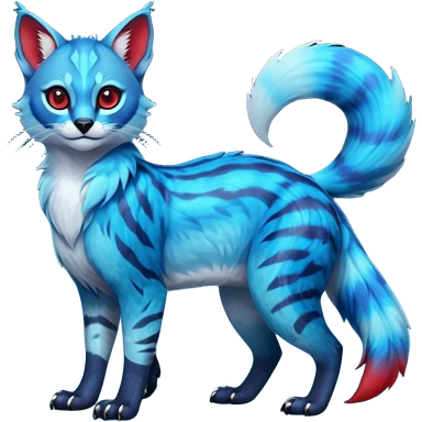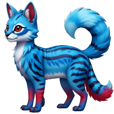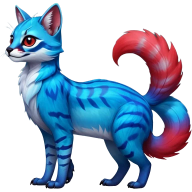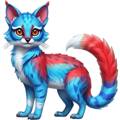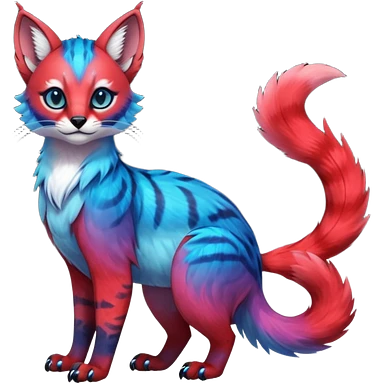 Cute kawaii cool edgy badass vibrant cyan-cobalt-blue-to-crimson-red gradient-colored iridescent glossy fur fantasy-caracal-civet-genet-sergal-vernid-Gryphon-Cacomistle-Trico-oncilla-animal-Fakémon-hybrid-fursona (full body), facial markings, (realism style) emoji