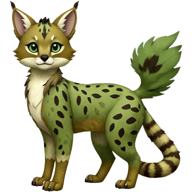 Cute kawaii cool edgy badass sage-green and moss-brown camouflage-speckled matte fur fantasy-caracal-civet-genet-sergal-vernid-Gryphon-Cacomistle-Trico-oncilla-animal-Fakémon-hybrid-fursona (full body), facial markings, (realism style) emoji
