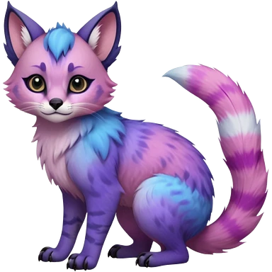 Cute kawaii cool edgy badass pastel cotton-candy pink-blue-purple gradient fluffy fur fantasy-caracal-civet-genet-sergal-vernid-Gryphon-Cacomistle-Trico-oncilla-animal-Fakémon-hybrid-fursona (full body), facial markings, (realism style) emoji