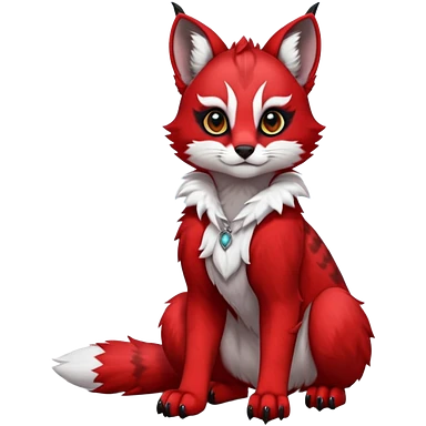 Cute kawaii cool edgy badass bright cherry-red fur with clean snow-white chest and muzzle fantasy-caracal-civet-genet-sergal-vernid-Gryphon-Cacomistle-Trico-oncilla-animal-Fakémon-hybrid-fursona (full body), facial markings, (realism style) emoji