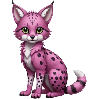 Cute kawaii cool edgy badass soft magenta fur with pearly-white polka dots and subtle shimmer fantasy-caracal-civet-genet-sergal-vernid-Gryphon-Cacomistle-Trico-oncilla-animal-Fakémon-hybrid-fursona (full body), facial markings, (realism style) emoji