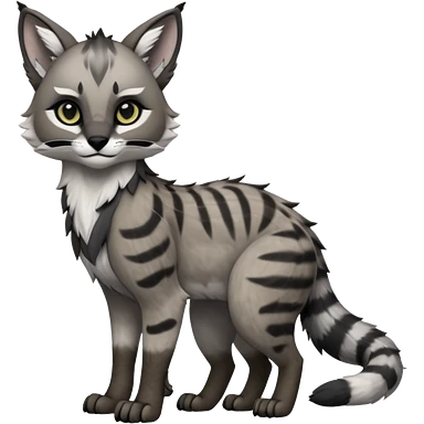 Cute kawaii cool edgy badass ashen grey fur with smoky charcoal ombré fade fantasy-caracal-civet-genet-sergal-vernid-Gryphon-Cacomistle-Trico-oncilla-animal-Fakémon-hybrid-fursona (full body), facial markings, (realism style) emoji