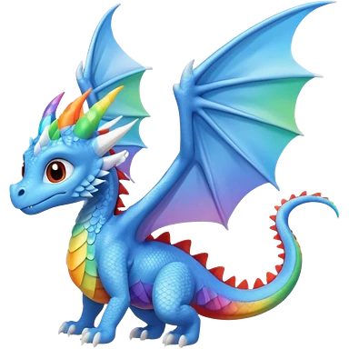 cute baby blue dragon with light blue body, big white wings, white horn, tail with white triangle tip, flying in side view, big eyes, small size, dragon ridge along back with small ridges in rainbow order: red, orange, yellow, green, blue, purple, ending at start of tail emoji
