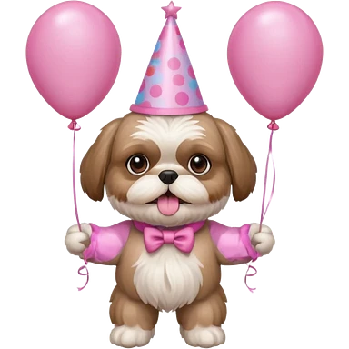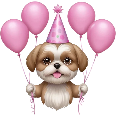 cute shih tzu hold a few pink balloons in both arms with pink birthday hat emoji