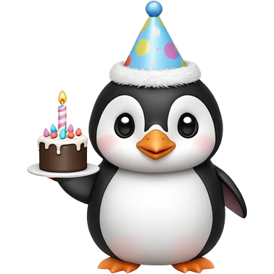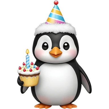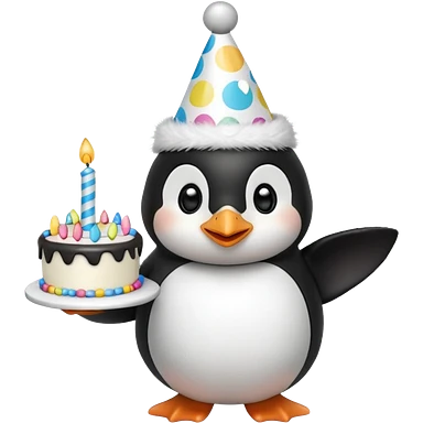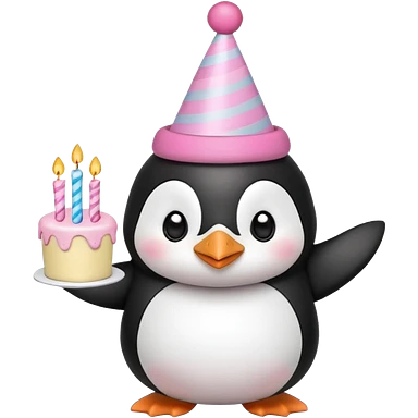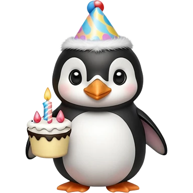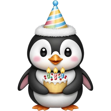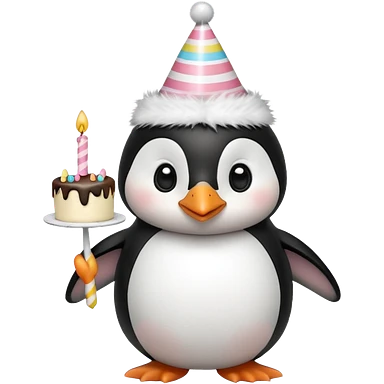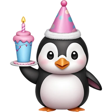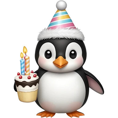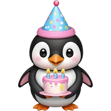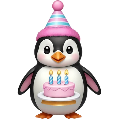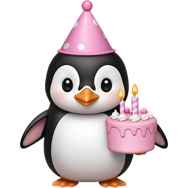 cute penguin hold a birthday cake in both arms with pink birthday hat emoji
