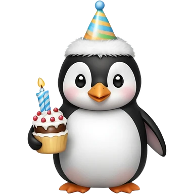 cute penguin with birthday hat hold a birthday cake in arms emoji