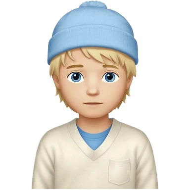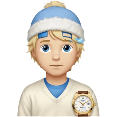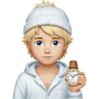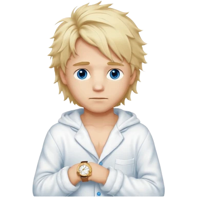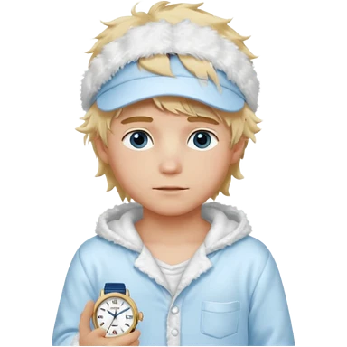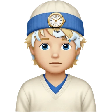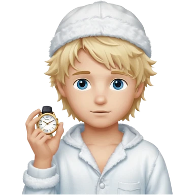 Create a look for a blond boy with long, tousled hair, light eyes, a white sweater, a wealthy appearance, blue eyes, and accessories like a Rolex or Cartier watch, and a cute face with messy hair down. blue eyes + + pajama white fluffy + cap fluffy emoji