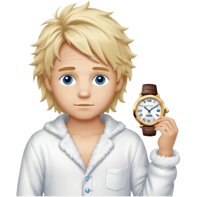 Create a look for a blond boy with long, tousled hair, light eyes, a white sweater, a wealthy appearance, blue eyes, and accessories like a Rolex or Cartier watch, and a cute face with messy hair down. blue eyes + + pajama white fluffy emoji