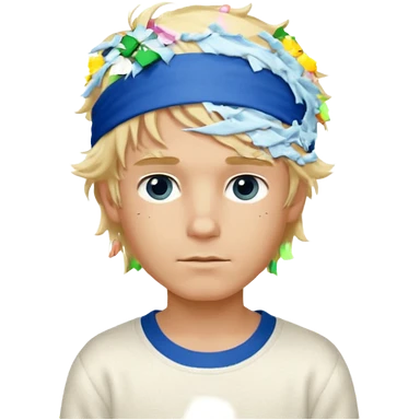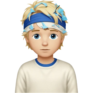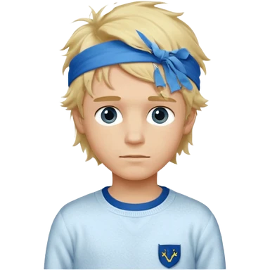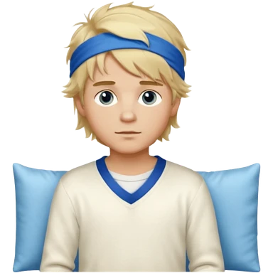 Create a look for a blond boy with long, tousled hair, light eyes, a white sweater, a wealthy appearance, blue eyes, and accessories like a Rolex or Cartier watch, and a cute face with messy hair down. blue eyes + headband white + pajama emoji