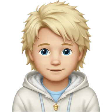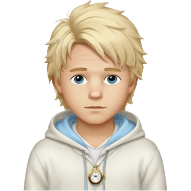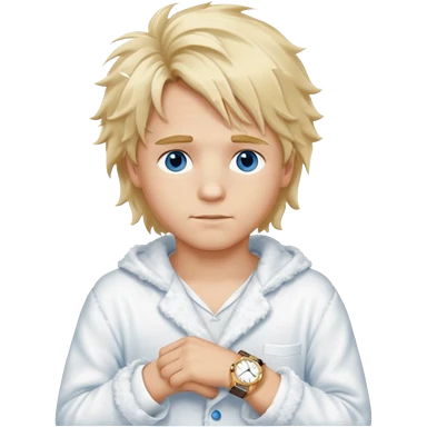 Create a look for a blond boy with long, tousled hair, light eyes, a white sweater, a wealthy appearance, blue eyes, and accessories like a Rolex or Cartier watch, and a cute face with messy hair down. blue eyes + + pajama white fluffy + hood fluffy emoji