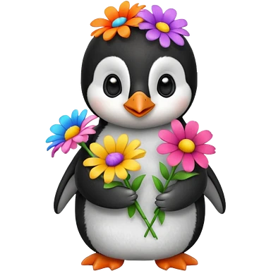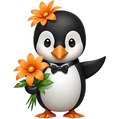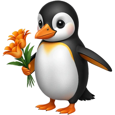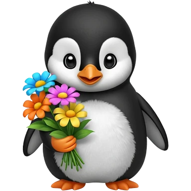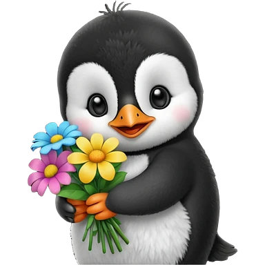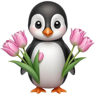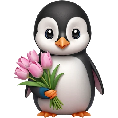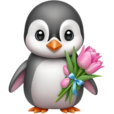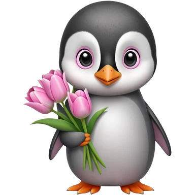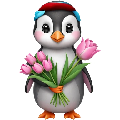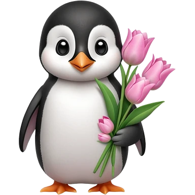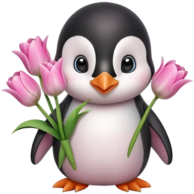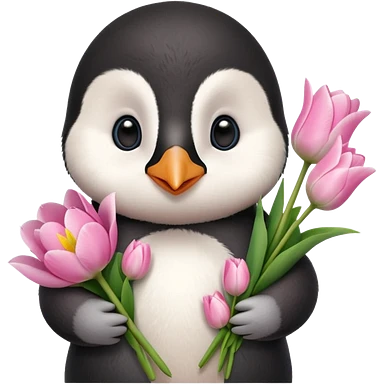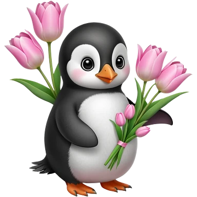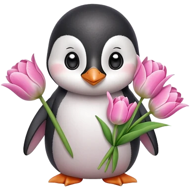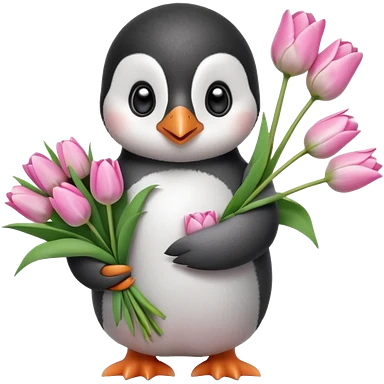 Cute baby penguin holding flower bouquet wraped in white paper and all flowers tulips in pink colour emoji | AI Emoji Generator
