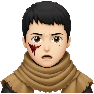 Guts from berserk, head shot, thick scarf covering mouth, scar over nose, black hair emoji