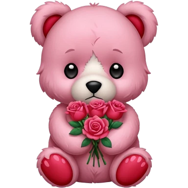 Cute pink teddy bear with sad puppy dog eyes holding roses emoji