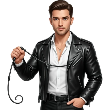 Sexy male dominator dressed in leather and holding a leather whip emoji