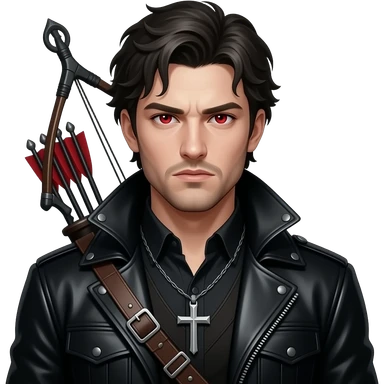 Gothic male with serious expression and red eyes wearing leather and carrying a crossbow emoji