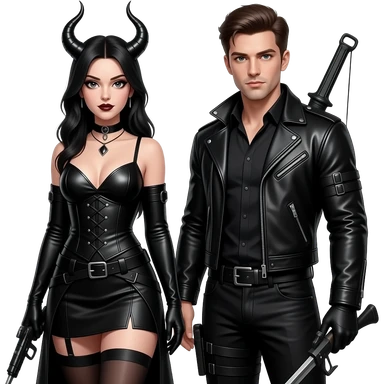 Gothic sexy dark female and male hunters with balck leather outfits emoji