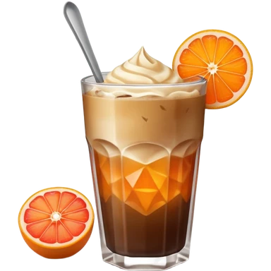 Emoji-style illustration of a grapefruit coffee in a faceted glass with iced dark coffee, light crema on top, orange peel garnish on the rim, and a small metal spoon. Cute modern iOS emoji look, smooth vector shapes, soft 3D shading, clean outlines, simple or transparent background, centered. emoji
