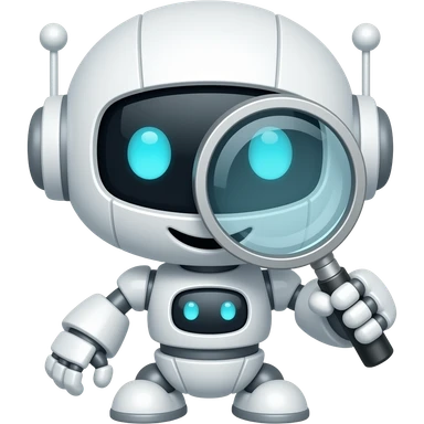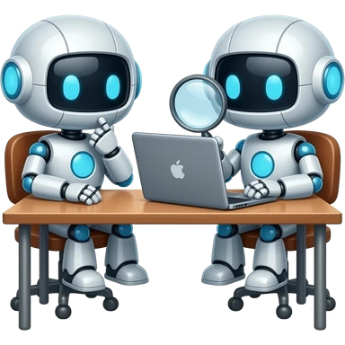 cute 2 robots use 1 mac book , use together -- 1 of them acting like thinking, another one hold mignifying glass emoji