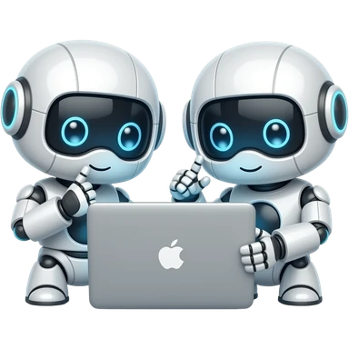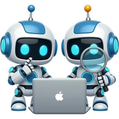 cute 2 robots use 1 mac book , use together -- 1 of them acting like thinking, another one hold mignifying glass, they try to find sth on macbook emoji