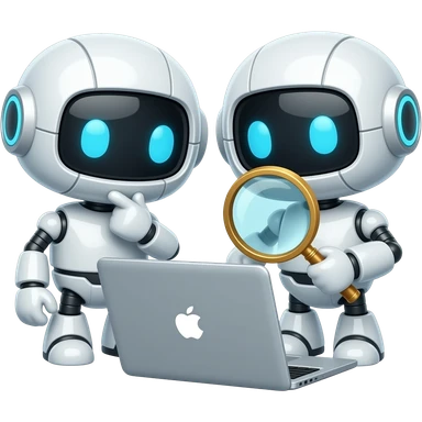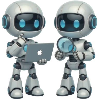 cute 2 robots use 1 mac book -- 1 of them acting like thinking, another one hold mignifying glass emoji