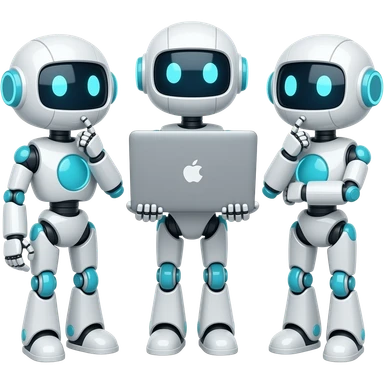 cute 3 robots use 1 mac book -- acting link it look for sth and thinking emoji