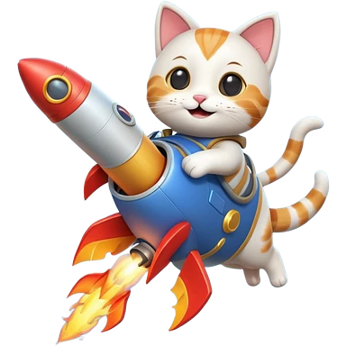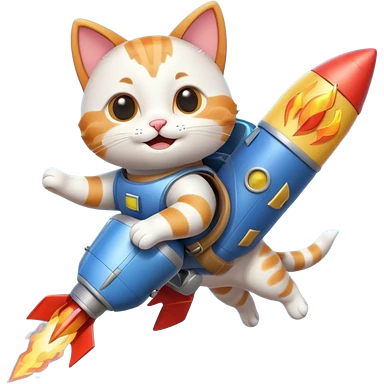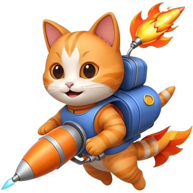 cute cat flying with a rocket pack on its back, rocket flames, happy face, 3D cartoon, mobile game icon style, clean background, no text, no watermark emoji