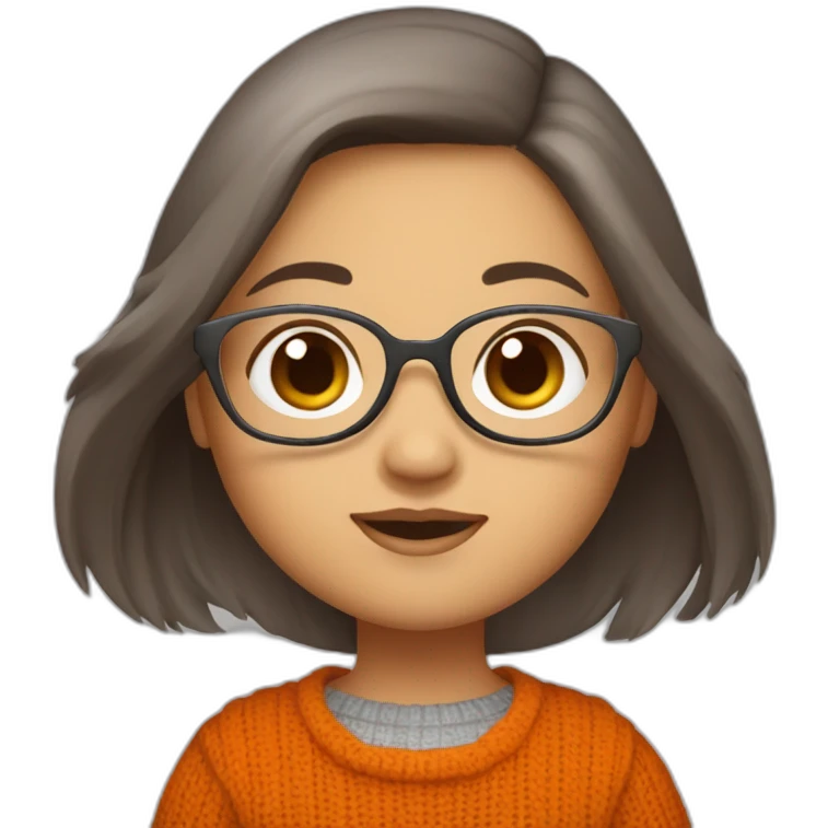 cute chubby girl with light grey glasses with long straight brown hair waving wearing a dark orange sweater emoji | AI Emoji Generator
