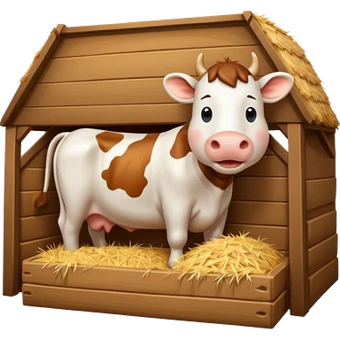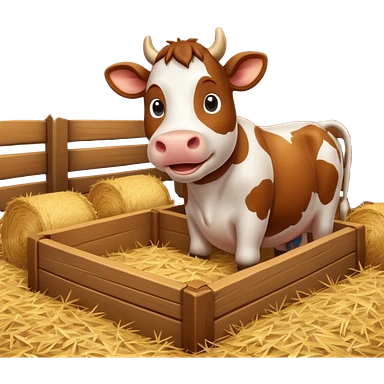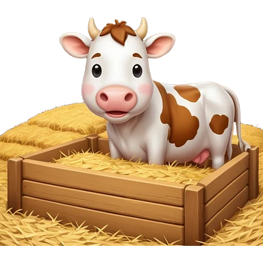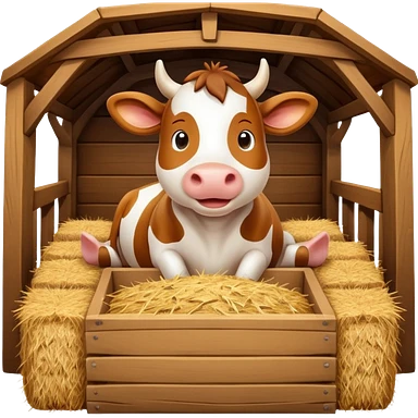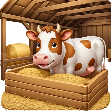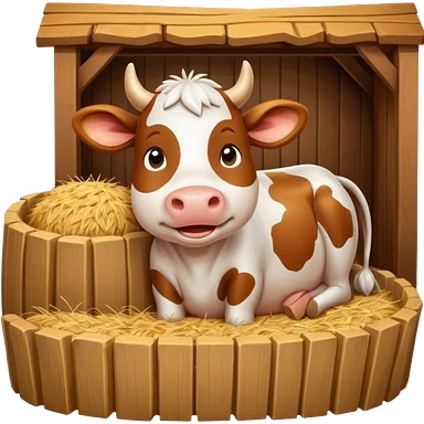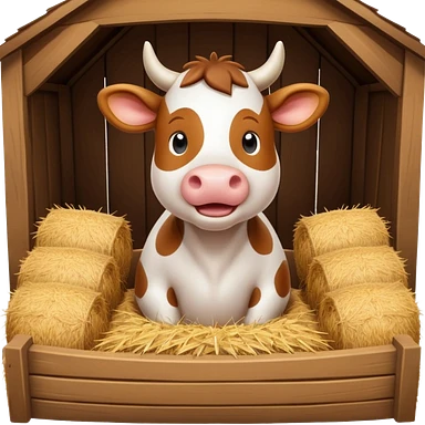 cute cow feeding scene inside a cow barn, wooden stable, hay bales, feeding trough, happy cow eating hay, warm farm lighting, 3D cartoon, mobile game icon style, clean background, no text, no watermark emoji