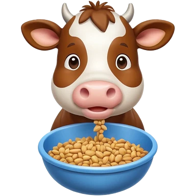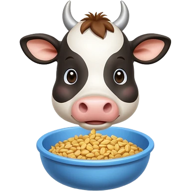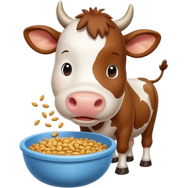 cute cow eating animal feed, hay and grains in a feeding bowl, 3D cartoon, mobile game icon style, clean background, no text, no watermark emoji