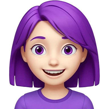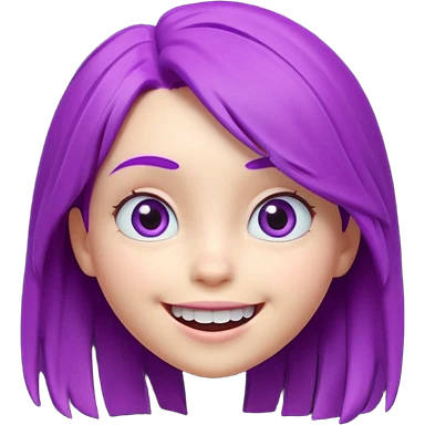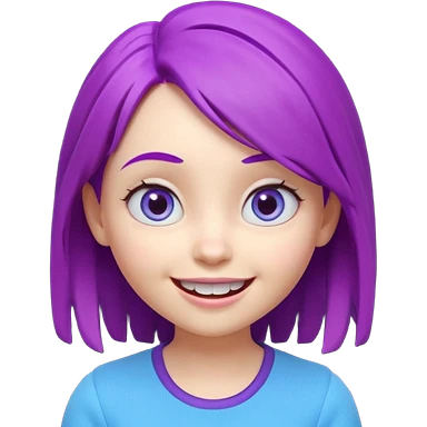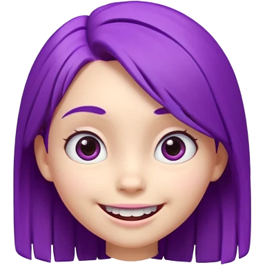 A cute 3D animated emoji character of a young girl face with vibrant purple hair. She has big expressive eyes and a wide happy smile showing teeth. The style is like a Pixar or Disney movie character, soft textures, high quality CGI render, isometric view, on a solid plain white background. emoji