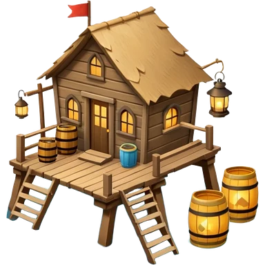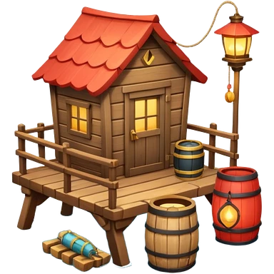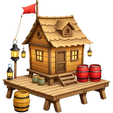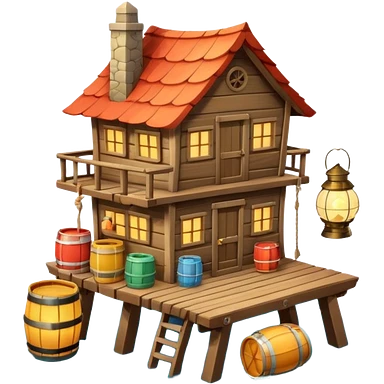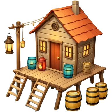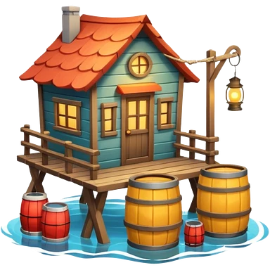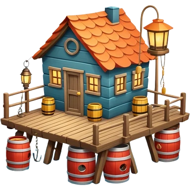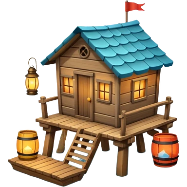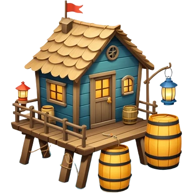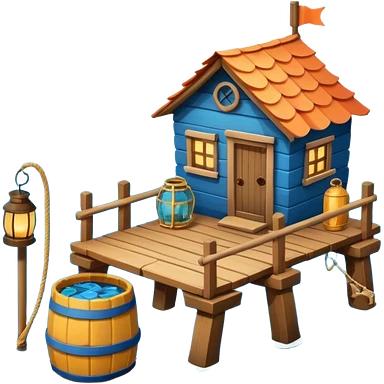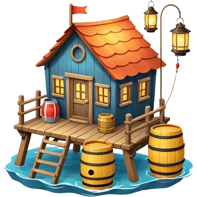 fisherman house on a wooden pier, small dock, fishing nets hanging, barrels, lantern, ocean vibe, 3D cartoon, cute mobile game icon, clean background, no text emoji