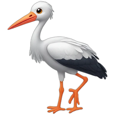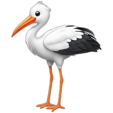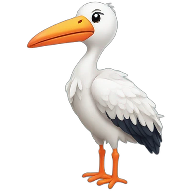 A big white stork carrying a bundle of cloth in its beak that has a cute white skinned baby face peeking out from it with black head emoji