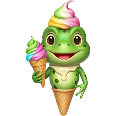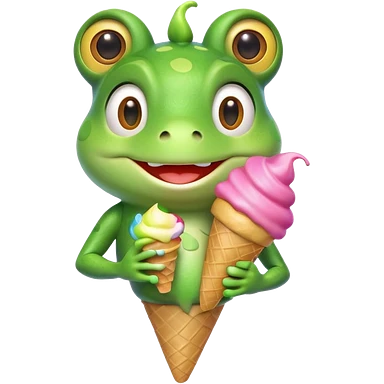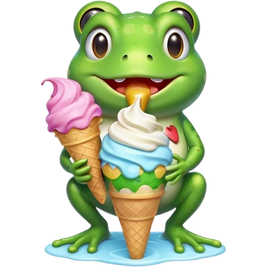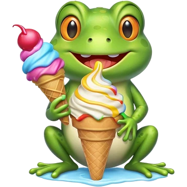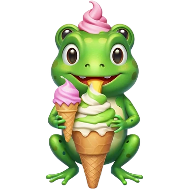 cute frog eating ice cream, happy face, holding a colorful ice cream cone, 3D cartoon, mobile game icon style, bright colors, soft shadows, clean background, no text, no watermark