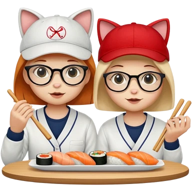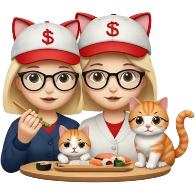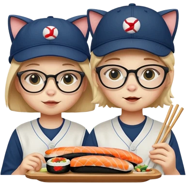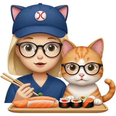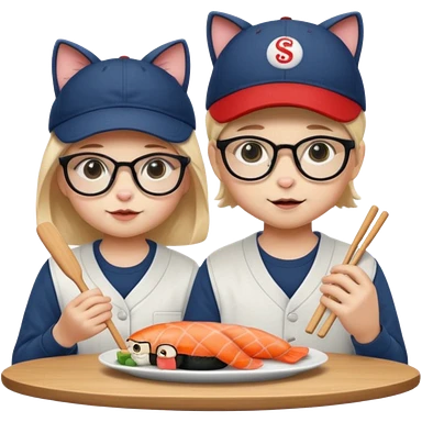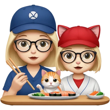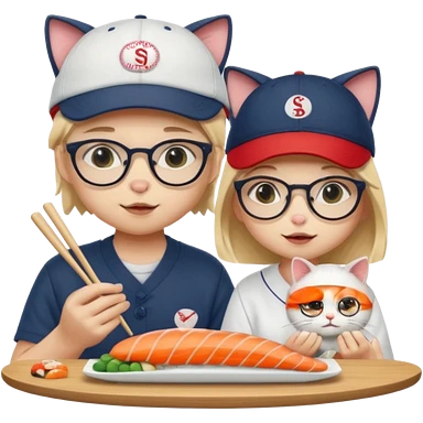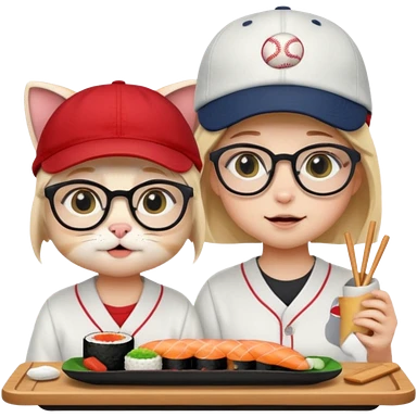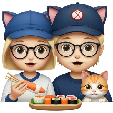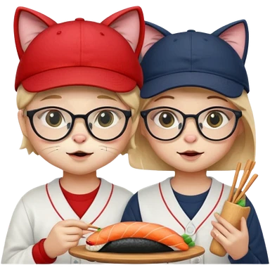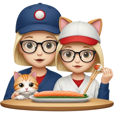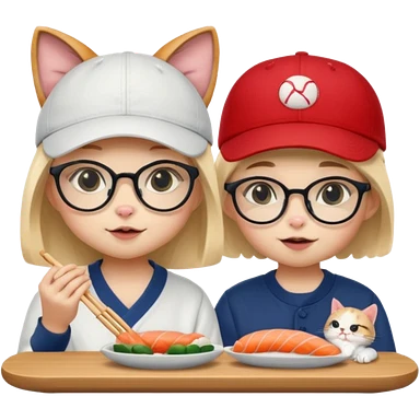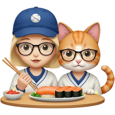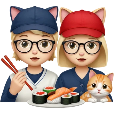 cute girl cat wearing glasses and a cute boy cat wearing a baseball cap eating sushi together emoji