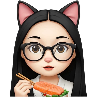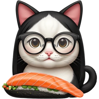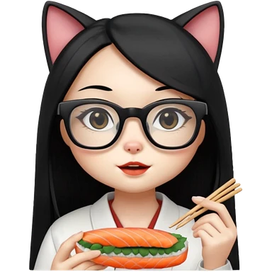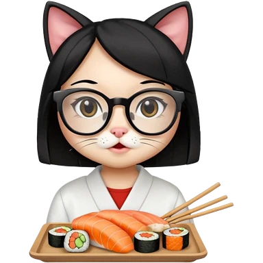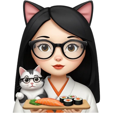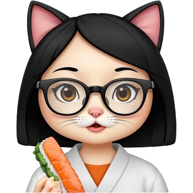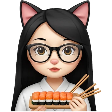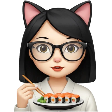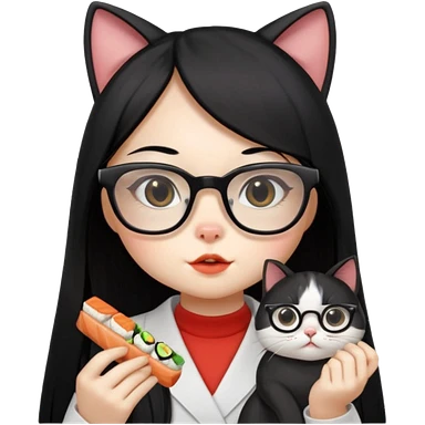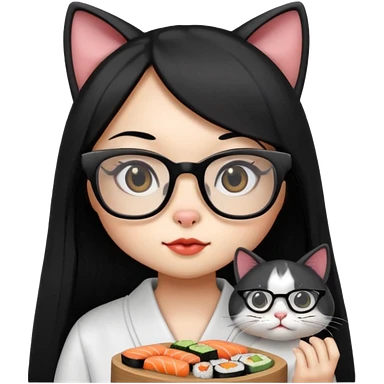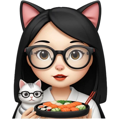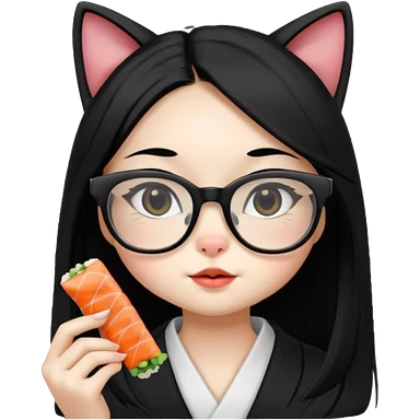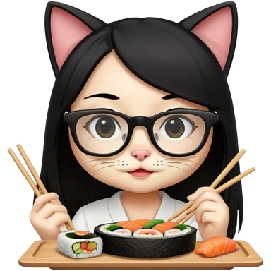 cute girl cat with long straight hair and really big square glasses with super thin frames eating sushi emoji
