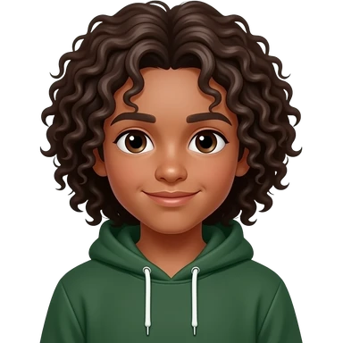 young cute teen boy with dark brown skin and really long tight curly hair wearing a dark green hoodie emoji