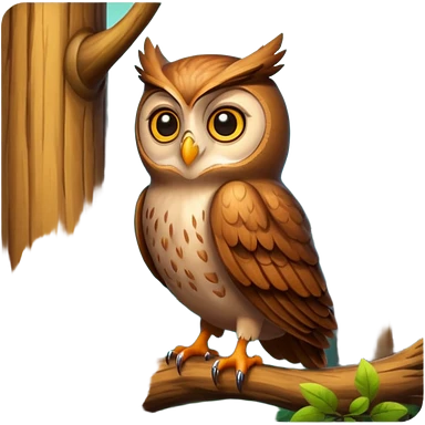 A cute, round owl with big, expressive eyes, perched on a branch under a starry night sky, with soft feathers and a small moon in the background. emoji