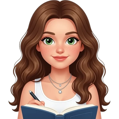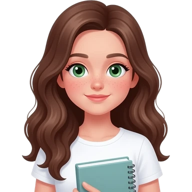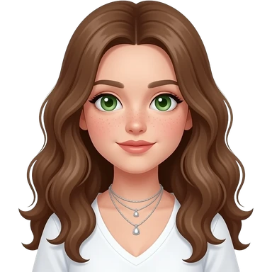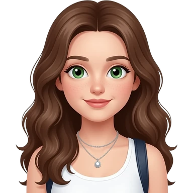 CUTE GIRL WITH WAVEY LONG BROWN HAIR AND GREEN EYES IN CUTE WHITE TOP emoji | AI Emoji Generator