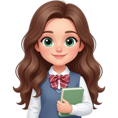 CUTE GIRL PREPPY WITH not volominous WITH WAVEY LONG BROWN HAIR, FRECKLES AND GREEN EYES IN CUTE TOP WITH NECKLES, STUDY GIRL emoji