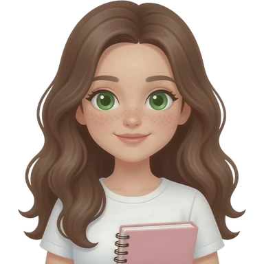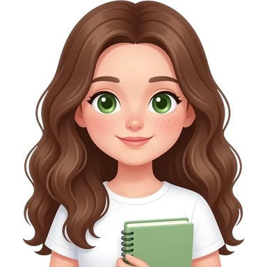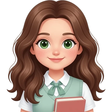 Cute study girl, Long BROWN wavy hair, green eyes, soft smile, aesthetic, minimal, pastel colors, cozy study vibe, holding book or notebook,PREPPY VERY PRETTY FACE WITH FRECKLES emoji
