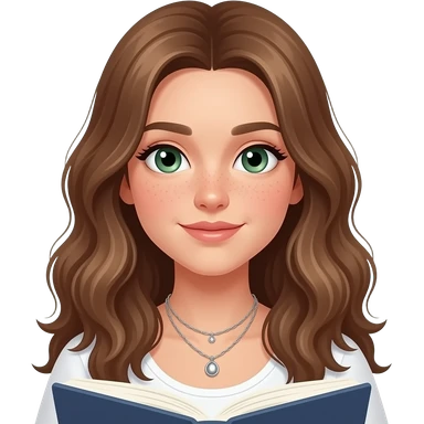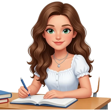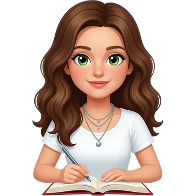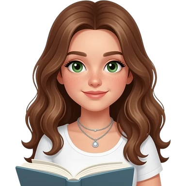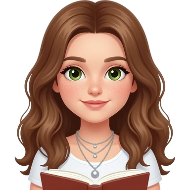 CUTE GIRL PREPPY WITH not volominous WITH WAVEY LONG BROWN HAIR, FRECKLES AND GREEN EYES IN CUTE WHITE TOP WITH SILVER NECKLES, STUDY GIRL emoji