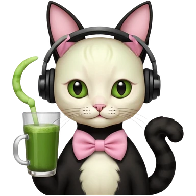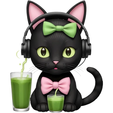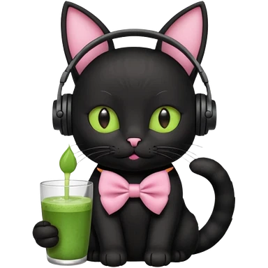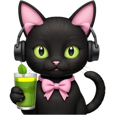 A black cat wearing cute headphones with a glass of matcha, a pink bow on his ear emoji