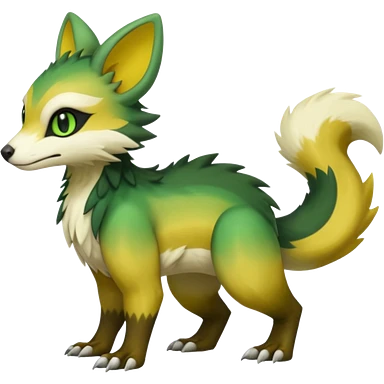 Cute cool handsome pesky vile feral realistic fantasy Green-yellow-brown-black-white-gradients Trico-Sergal-Furret-Vernid-fusion-Fakemon-animal-hybrid-creature, full body emoji