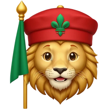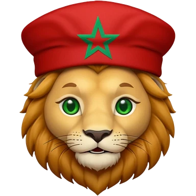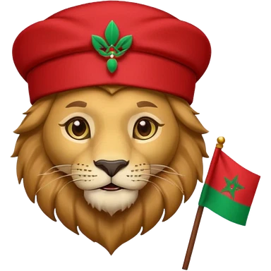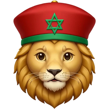 Cute lion emoji face wearing a red Moroccan fez with a green star on the front and a black tassel on the right side. Solid dark-blue background.emoji