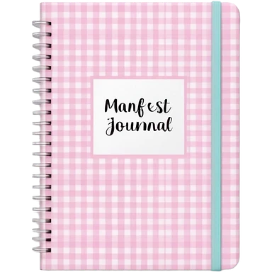 Cute manifest journal cover, pastel pink gingham pattern Handwritten feminine typography, soft aesthetic, cozy girl vibe Clean product mockup, minimal shadows, lifestyle stationery style emoji